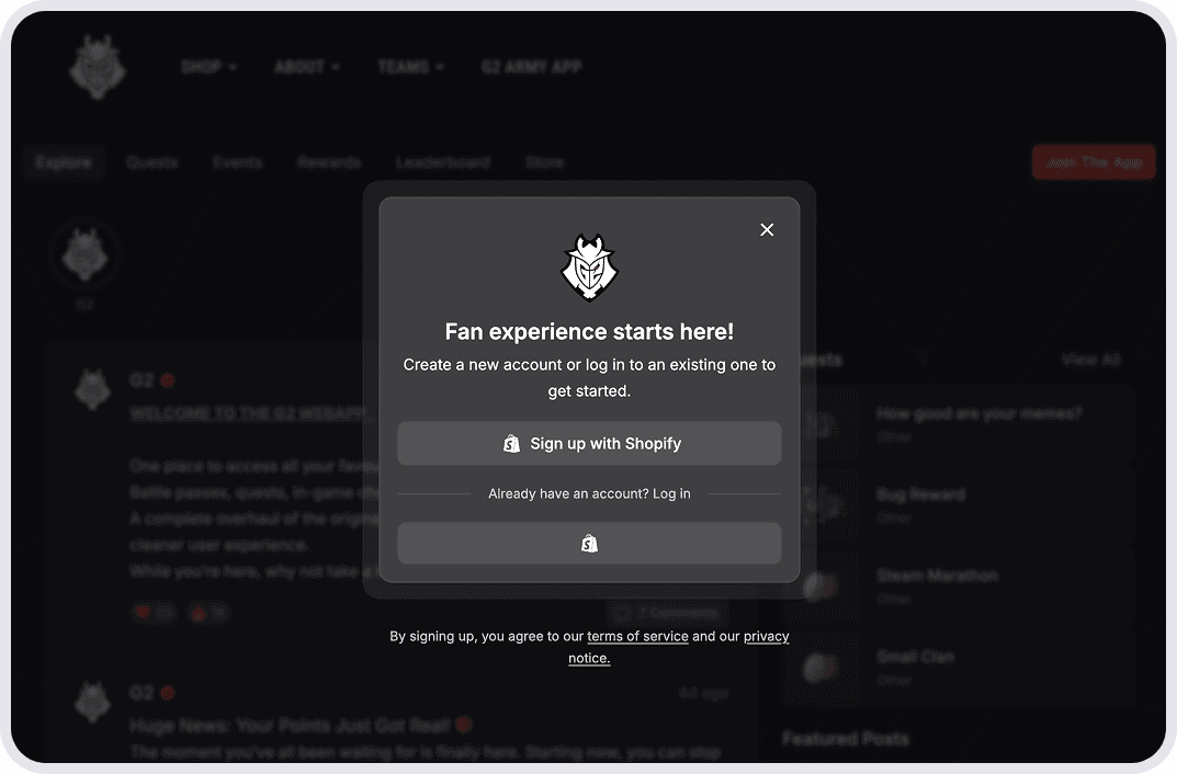Users can access your new FanBase-powered fan app using their existing Shopify credentials. No need for separate accounts, no friction in the onboarding process. If they're already a customer, they're automatically part of your fan community.